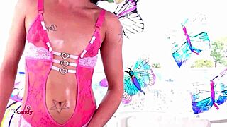 Amateur shemale strokes monster cock in lingerie solo