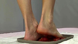 Beautiful feet pee on and trample fresh strawberries