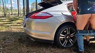 They get amused by honks while she gives him a blowjob in the woods