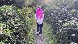 Watch this crazy hiker babe fuck hard in forest outdoors?