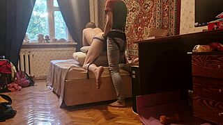 russian couple gets wild with strapon on couch 😈