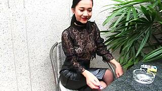 Leather-Skirted Teen Smokes Topless Outdoor Temptation!