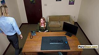 Redhead teacher milf jessica aaren dominates student on office desk!