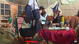 two stunning witches in stockings deepthroat and fuck a handsome guy hard