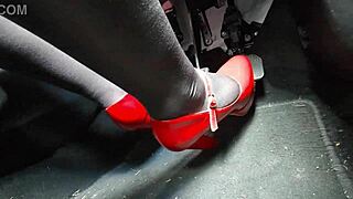 Redhead pumps pedals in heels heading to the office hidden cam style